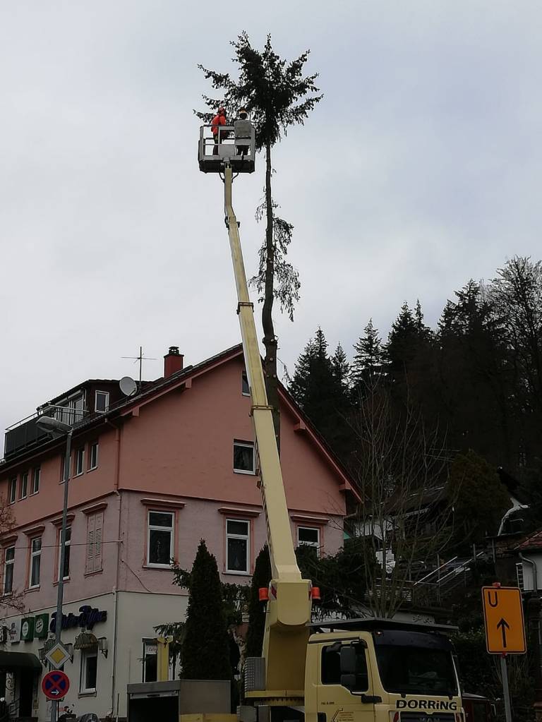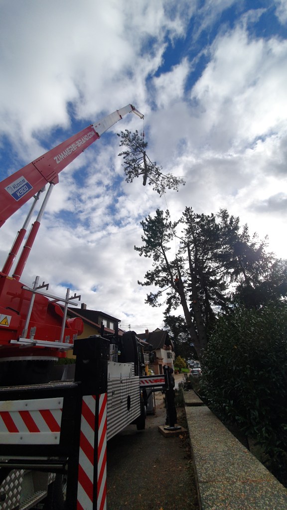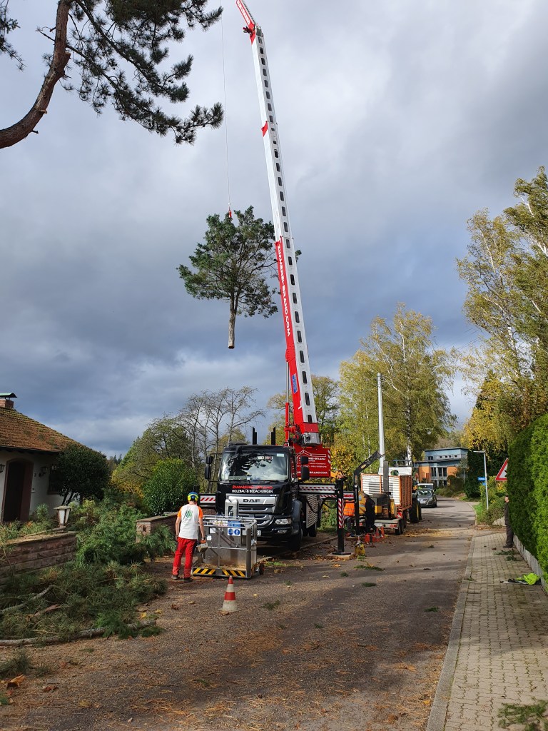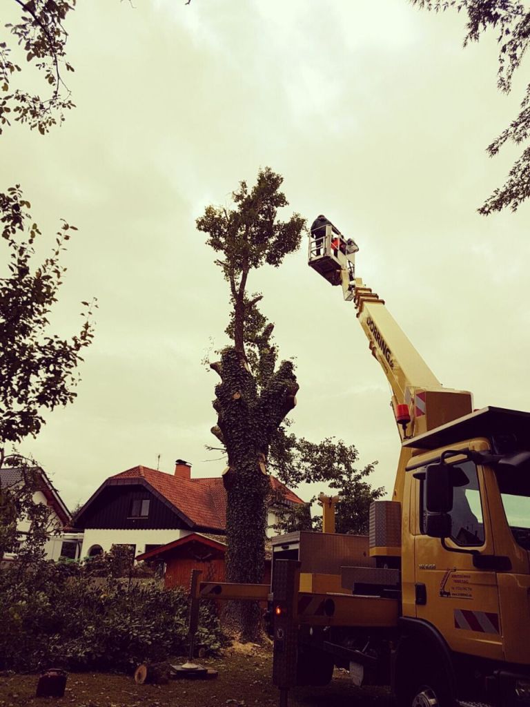 Solange in einem Garten genügend Platz ist, wird der Baum als Ganzes umgesägt. Sobald jedoch Straßen oder Gebäude eine Ganzbaumfällung ausschließen, müssen wir auf alternative Techniken zurückgreifen. Dazu gehört z.B. die Fällung mittels Seilklettertechnik oder der Einsatz von Hubarbeitsbühnen oder Lastenkränen.
